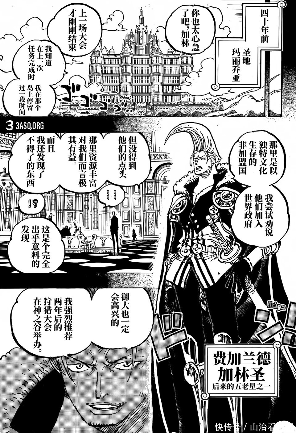 在40年前的圣地玛丽乔亚,加林圣向五老星申诉职责,还想要举办狩猎动作,五老星说他太心急了,上一次的狩猎动作才范畴不久。加林圣在神之谷磨蹭了一段技能,还劝说神之谷的国王加盟天下政府,并莫得奏凯。神之谷有丰富的矿产资源,还有一个不测得益,伊姆大东说念主想必会欢快的,两年的狩猎大赛就在神之谷举行。