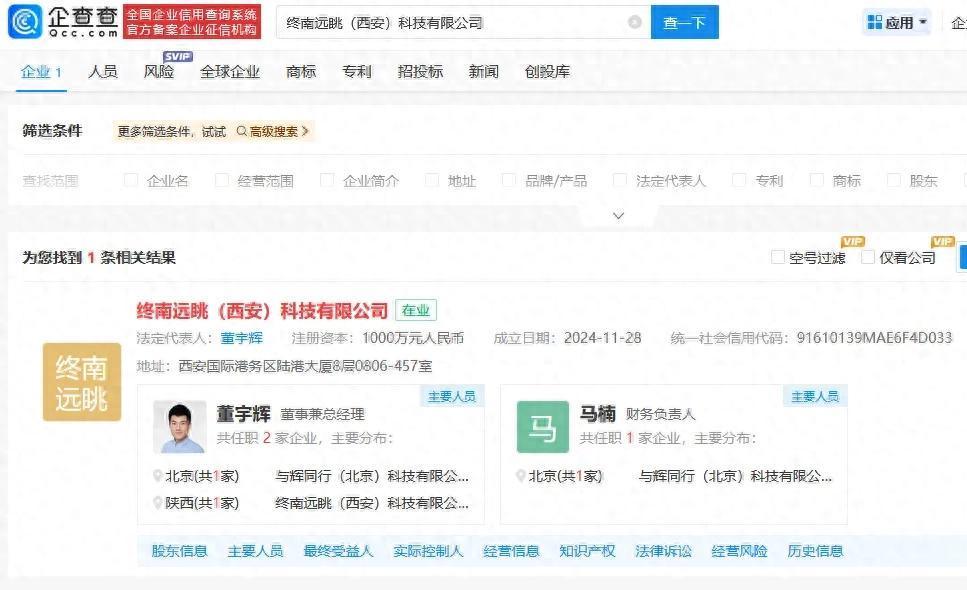 数据流露,终南瞭望(西安)科技有限公司诞生于2024年11月28日,注册地位于西安外洋港务区(西安浐灞外洋港),法定代表东说念主为董宇辉,财务厚爱东说念主为马楠。