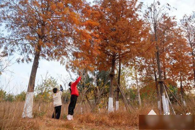 这里亦然不雅赏落羽杉的绝佳行止。成片的落羽杉林在冬日披上橘红与深红交织的衣服,宛如焦糖色的丛林,在暖阳基层叠晕染。在落羽杉下铺上野餐布,围坐一圈享受冬日暖阳,你也成了油画中的一景。