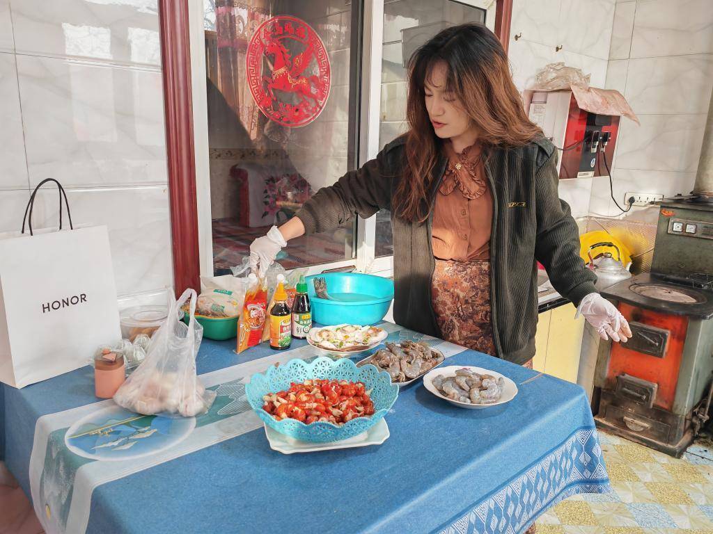 吴维东的儿媳赵次男正在为家东谈主准备海鲜等。新华社记者 许晋豫 摄