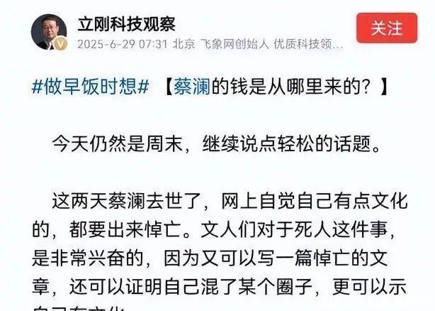 项立刚选拔在蔡澜离世后发声,如实容易激励 “蹭热度” 的质疑。但翻看他的账号,不难发现这位科技博主向来以谏言著称。他曾炮轰过流量明星的差错东谈主设,也品评过文化圈的焦躁习气。这次对蔡澜的批判,是否真如他所说 “憋了多年的诚意话”?值得玩味的是,不少被他怼过的名东谈主粉丝,这次竟冷漠地站在他这边。