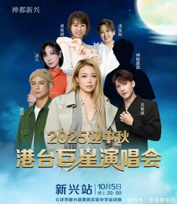 近日,有网友发布海报,称容祖儿、关智斌、侧田、卓依婷、泳儿、汤宝如等歌手将亮相在广东省云浮市新兴县举办的“2025迎中秋港台巨星演唱会”。海报闪现,该演唱会定于2025年10月5日在新兴县黄岗实践中学体育场举行,门票价钱从188元至888元不等。