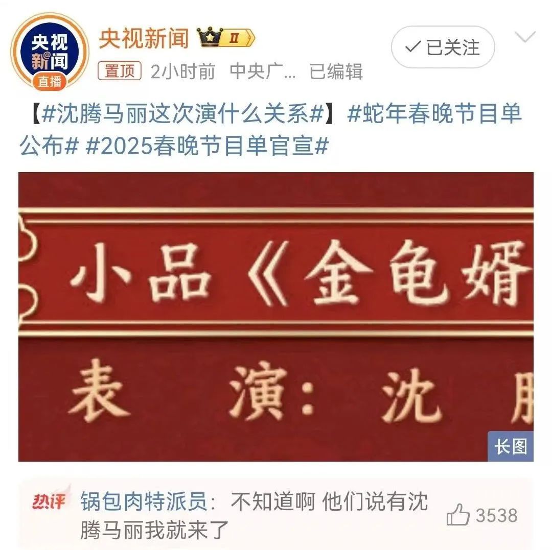 2025年的春晚上,沈腾和马丽将与其他演员一谈出演小品《金龟婿》。