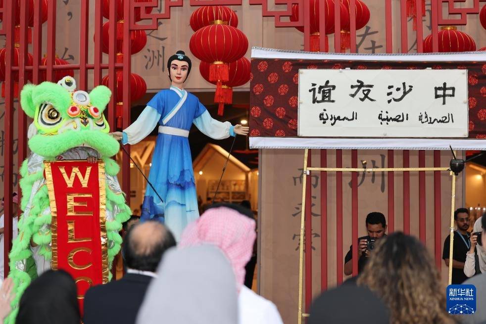 11月13日,在沙特皆门利雅得,嘉宾在第三届沙特阿拉伯海外手工艺周中国馆赏玩木偶。