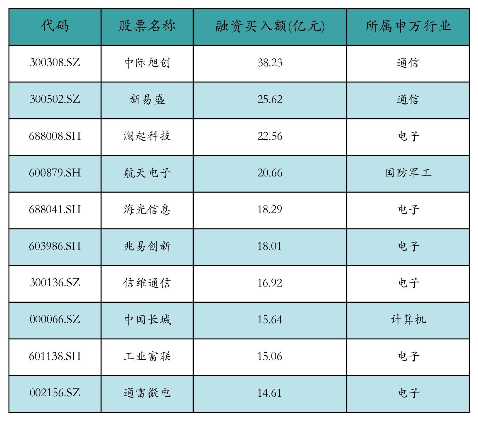 两市共有3477只个股有融资资金买入,其中中际旭创、新易盛、澜起科技名次前三,买入金额永诀38.23亿元、25.62亿元、22.56亿元。融资买入额前10个股细则见下表: