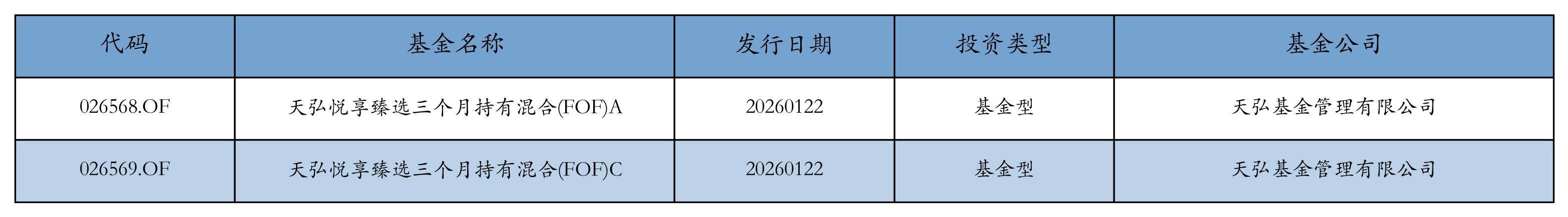 昨日有2只新基金刊行,永诀为:天弘悦享臻选三个月握有夹杂(FOF)A、天弘悦享臻选三个月握有夹杂(FOF)C,细则见下表: